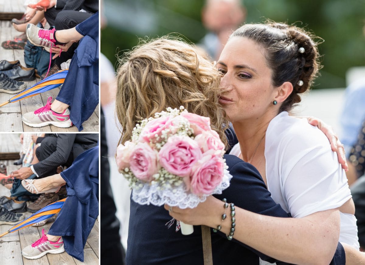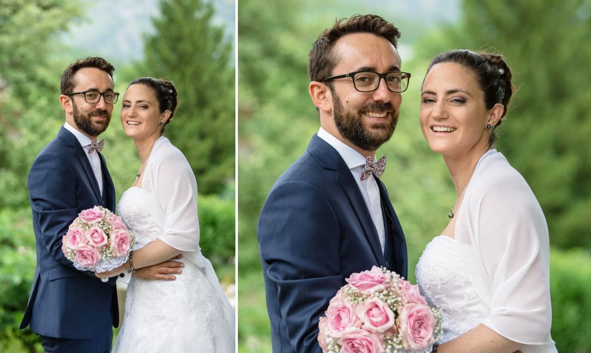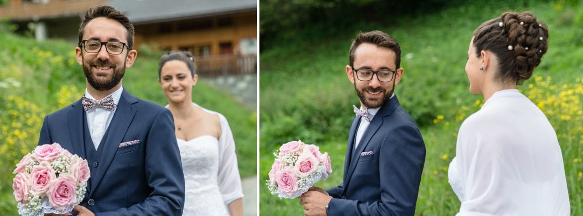 Initialement, nous avions prévu d’aller au Lac de Tueda pour faire des photos avant les cérémonies de mariage. En fin de compte, nous sommes restés au village de Méribel. L’idée était de pouvoir vite nous abriter en cas d’orage. Par contre, ce n’était pas quelques gouttes qui allaient nous empêcher de faire les photos de la découverte des mariés. Finalement, les dernières prévisions étaient les bonnes. Ouf, la grosse pluie est arrivée pendant les cérémonies puis le beau temps est progressivement revenu.